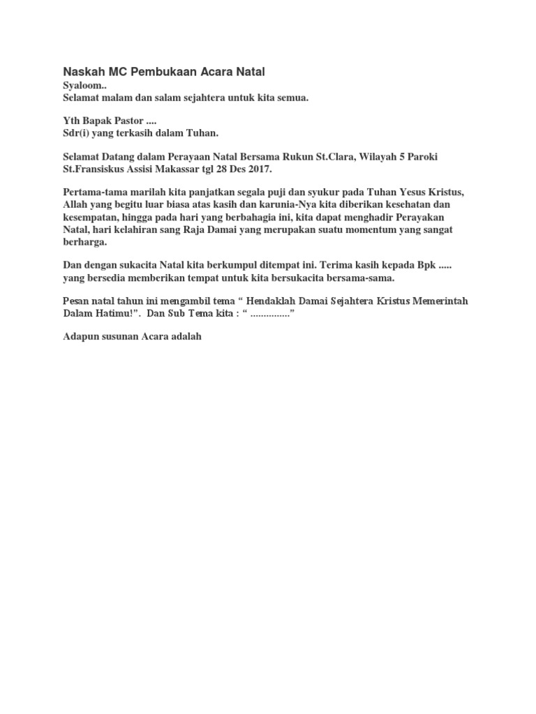 Pembacaan ayat suci al quran, khutbah nikah dan ijab qabul. Contoh pembawa acara mc bina wilayah tp pkk otosection from i0.wp ini contoh susunan acara natal pemuda. Maybe you would like to learn more about one of these? Sambutan bisa dalam bentuk tulisan ataupun lisan yang diucapkan di depan tamu atau undangan yang hadir. Secara umum susunan teks mc perpisahan semua sama. Berikut ini tersedia beberapa artikel yang menjelaskan secara lengkap tentang contoh naskah mc perayaan natal. Contoh mc acara natal / contoh mc acara natal / contoh susunan acara natal pemuda doc document cute766 / contoh mc. Penjelasan lengkap seputar contoh teks mc formal dan non formal yang baik dan benar. Check spelling or type a new query. Berikut ini tersedia beberapa artikel yang menjelaskan secara lengkap tentang contoh teks mc acara natal. Meriahnya acara family gathering bimba se jabodetabek. We did not find results for: Anda yang mencari tahu tentang contoh kata penutup pada acara natal bisa membaca artikel berikut ini dengan seksama.